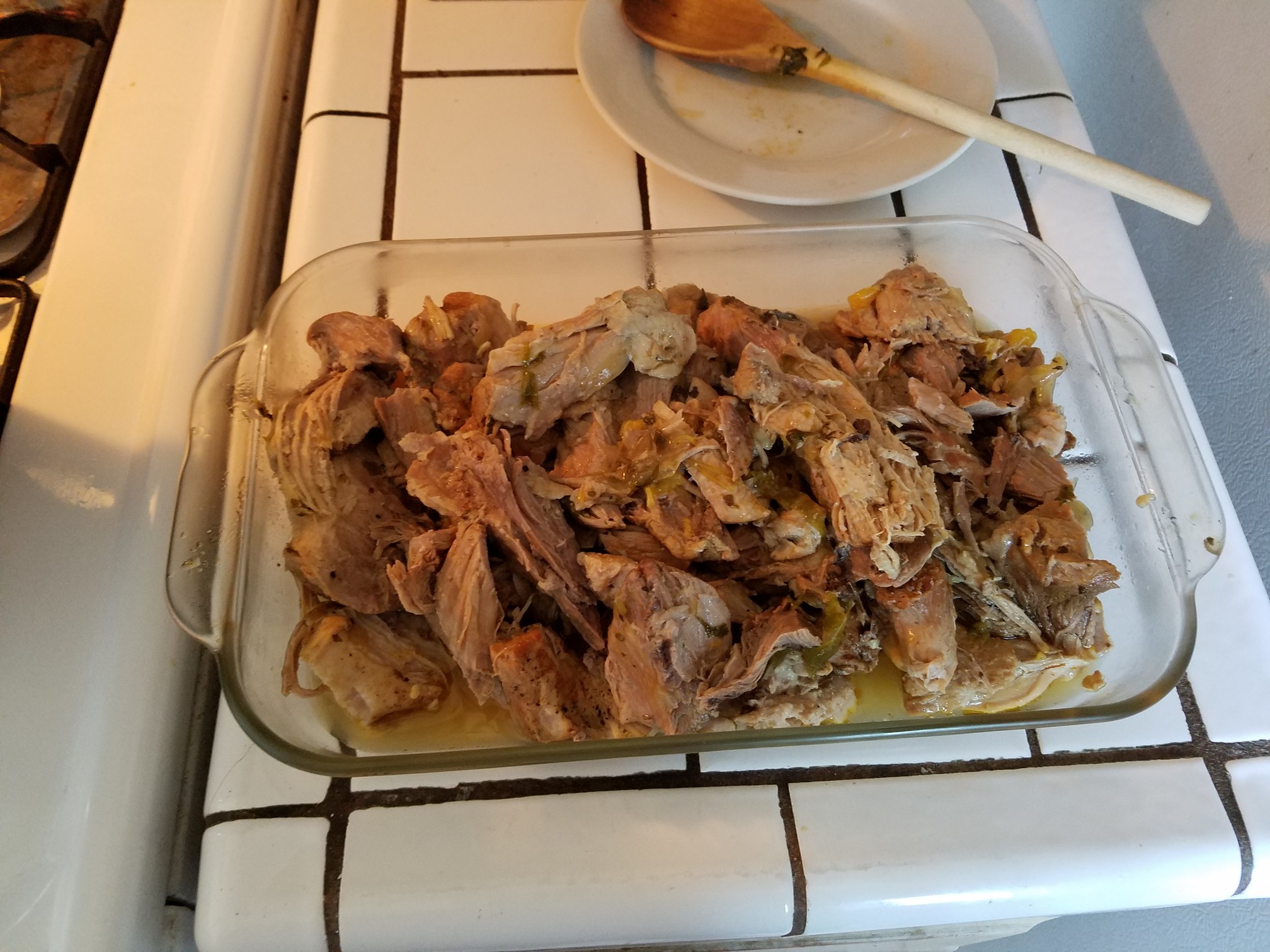 After removing the bone from the pot break up the meat into good size chunks and let simmer for maybe 20 minutes more. Turn off the heat and let the meat cool down for awhile, maybe 15 minutes or so because we’re going to be breaking up the cooked meat with our hands to remove any leftover gristle or bone. There really shouldn’t be that much leftover fat because this goddamn thing has rendered that shit down pretty well. If there is leftover fat you better be leaving that in there. Fat is good flavor!