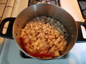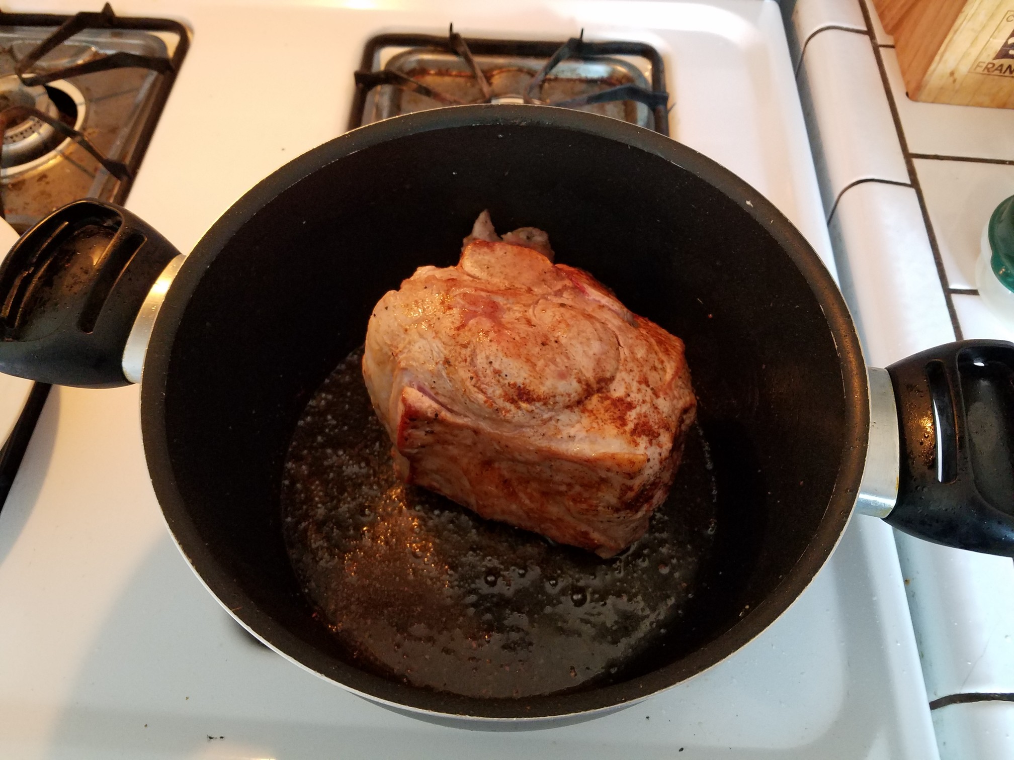 Get a small bowl or container and combine the cumin, chili powder and cayenne. Mix them together well. Get out your big ass Dutch oven and get it on the stove top over a medium heat and add the oil. Next get your slab of pig ready to sear. If your porker is too big to fit in the pot go ahead and cut it in half for ease of browning, cooking and turning.