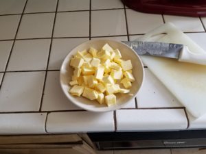 Chill your two sticks of butter, I put them in the freezer for about 15 minutes first, then chop the butter into smaller pieces like so.