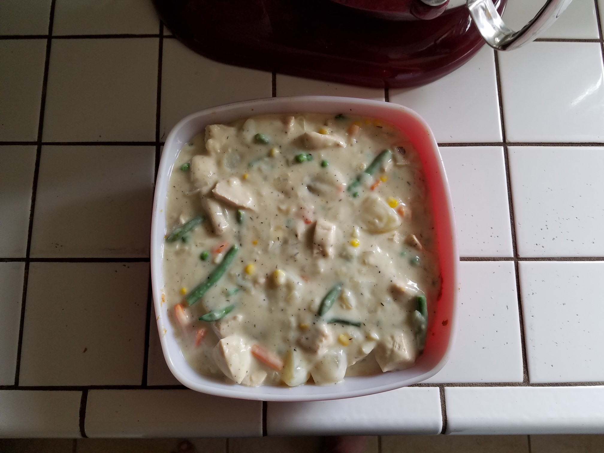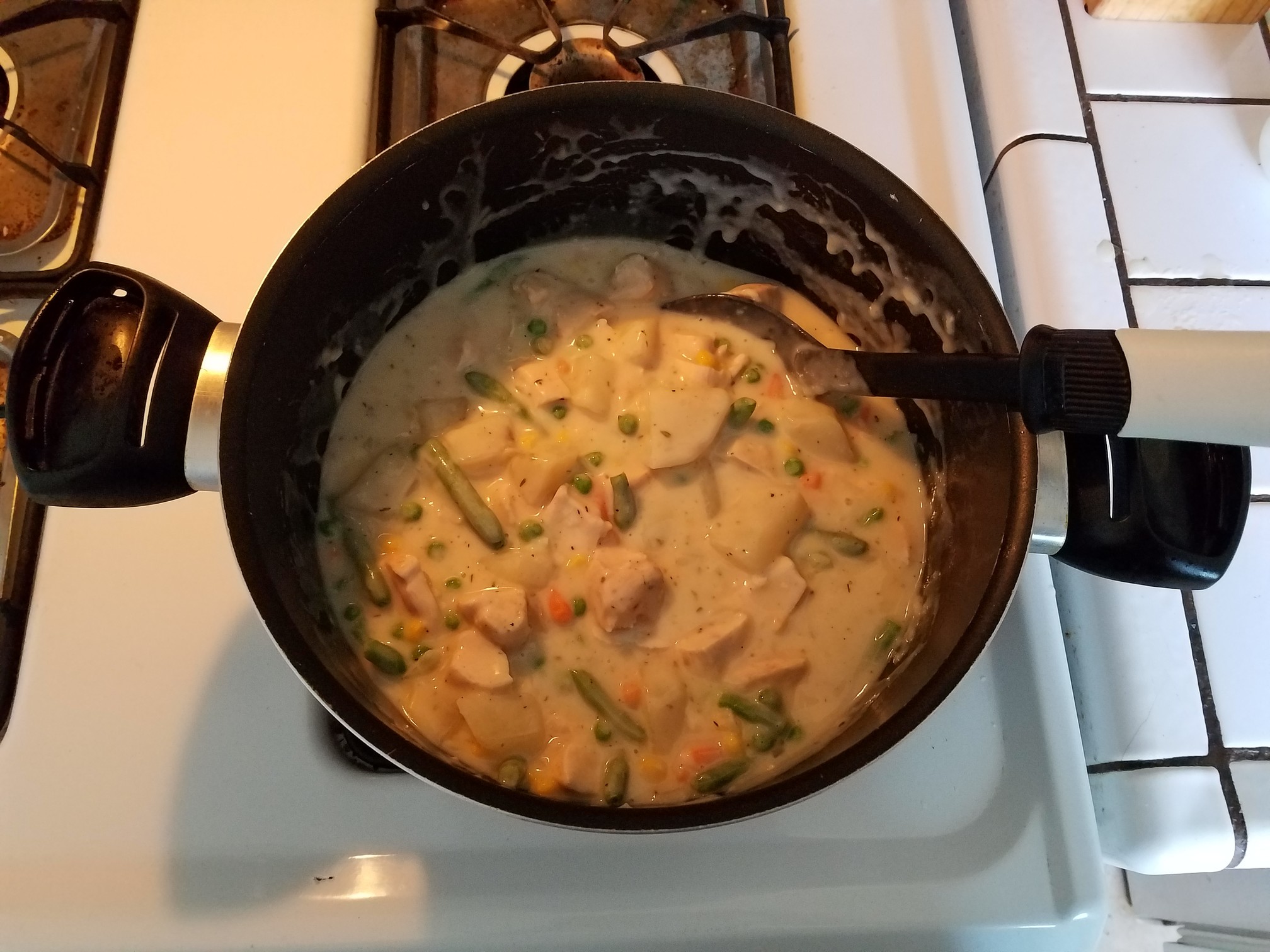 When the sauce is ready, turn the heat off of the burner and gently add in the mixed veggies, the chicken and the potatoes. Give a gentle stir or two and let rest until the sauce reaches about room temperature.