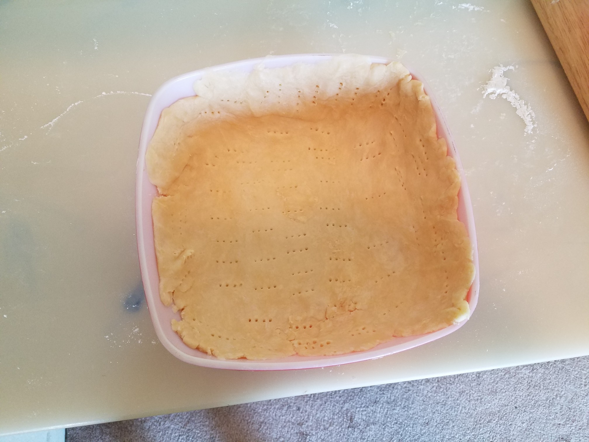 Use some flour to coat your rolling pin and let’s roll this shit out. Starting in the center, roll the dough outwards working from each direction. You want the dough to be about 1/8th of an inch thick when rolled. Get your casserole dish nearby and gently lift the dough up and form around the inside bottom of the casserole dish. There’s enough butter in this fucker that you won’t need to grease the pan. Using a fork, poke holes liberally around the dough so it doesn’t “poof” up while in the oven.