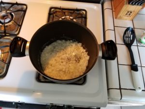 Get a deep pot or the trusty Dutch oven on the stove top and melt that 1/2 stick of butter in there. Next add in the onions and let’s give them a saute.