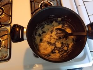 Stir the roux until the flour has been mixed in and it’s all blended together. Next step is adding in the chicken stock.