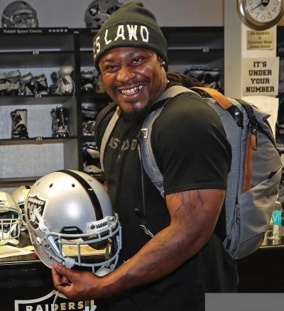MARSHAWN LYNCH doesn’t stop to chat; he simply races off and starts running through a tire drill.