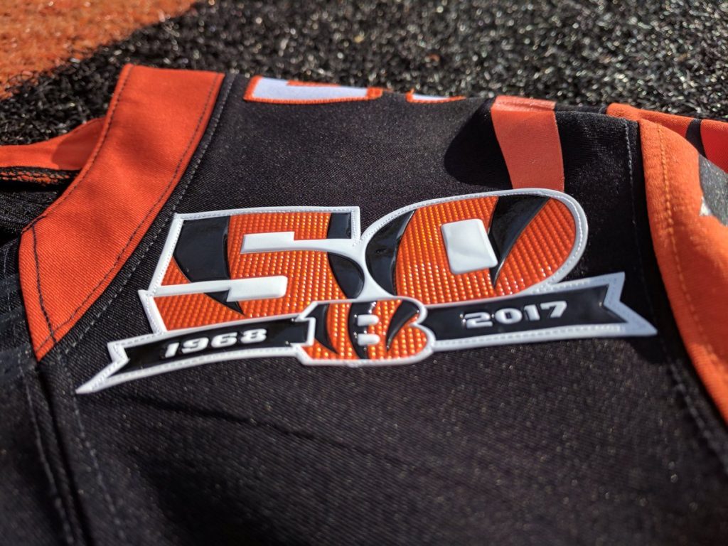That’s right! This is the 50th year of the Cincinnati Bengals and Mike Brown is putting off all the stops by putting an ugly patch on the jerseys. And that’s pretty much it. A patch on their current uniforms. They can’t go throwback due to NFL rules about changing helmets so we’re not getting the stripe-less jerseys with the BENGALS helmets because that would be too cool for the NFL. They could’ve at least switched to the nice subtle jerseys of the 1980-2003 due to stupid NFL rules about changing your jerseys and Mike doesn’t want to lose the orange jerseys for five years. But we’re getting a logo!