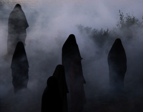 [He screams. The fog continues to roll in, obscuring almost everything; before the screen goes completely dark, we see what appears to be a few black-hooded figures surrounding HARRIS, before all of them disappear out of sight.]