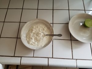 If you haven’t worked with gorgonzola before it’s got a funky rind to it. It’s chewy and not exactly pleasant to eat so I trimmed the rind away from the cheese. Add in the mayo and mix until smooth. If you want to put a tablespoon of sour cream in here that would work too. Next add in the minced garlic and the squeeze of lime. Finally salt and pepper to taste. I had some of this leftover after the wing extravaganza and it was so goddamn delicious I was just spreading it on a cracker.