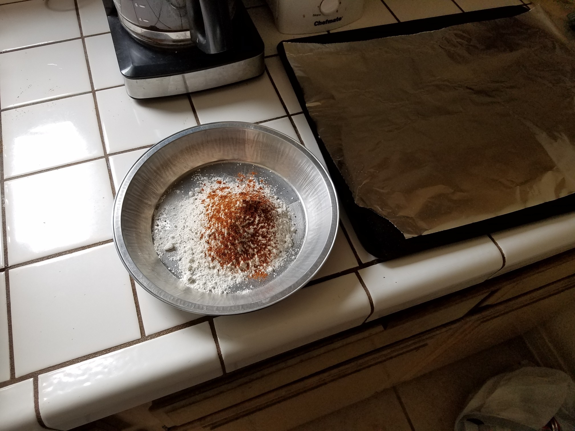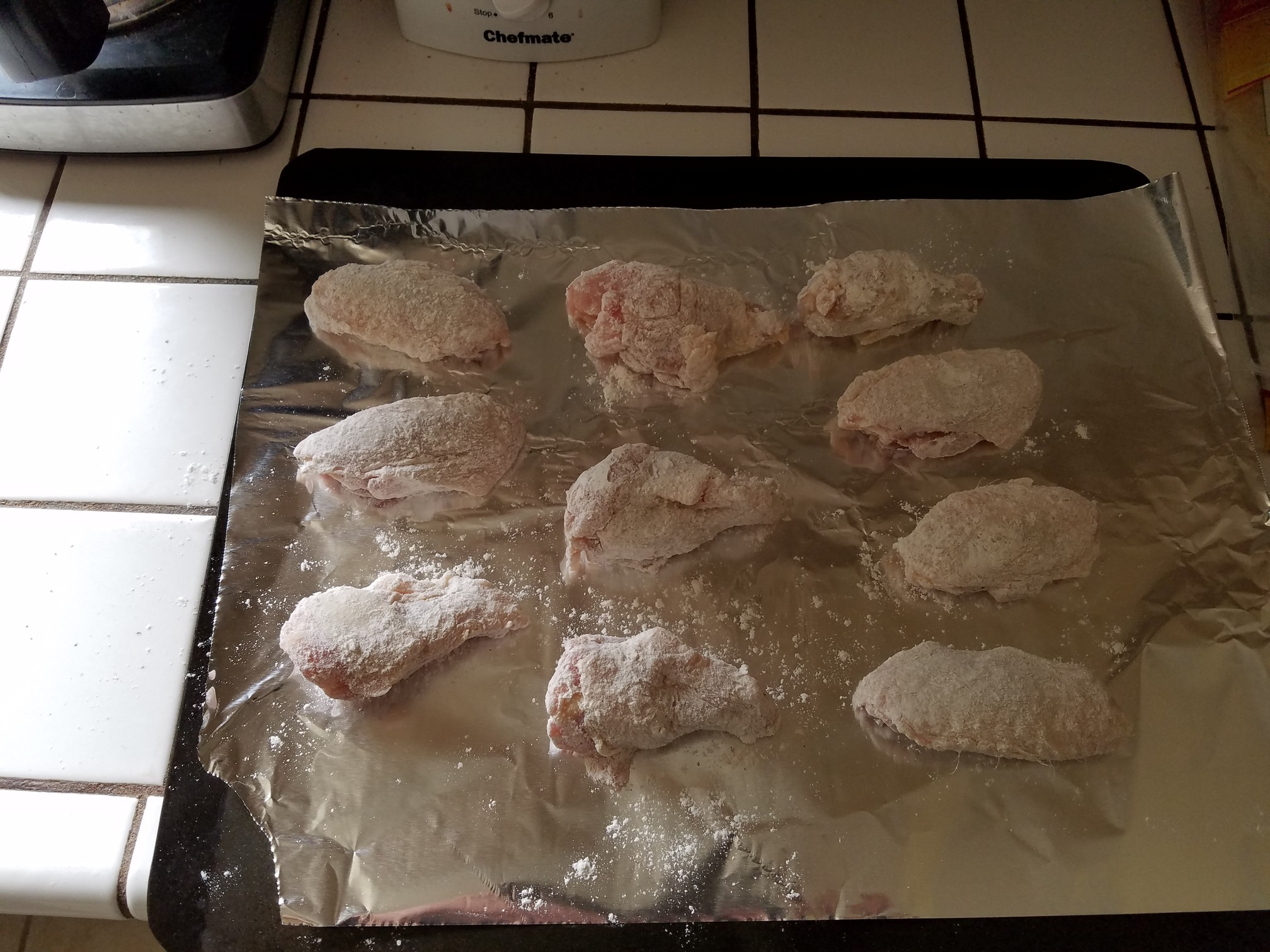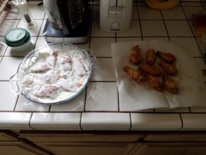 Here’s the trick, especially if you’re baking the wings, put the floured wings into the refrigerator for at least an hour, preferably two or even overnight. This allows the seasoned flour to firmly coat the wings prior to cooking.