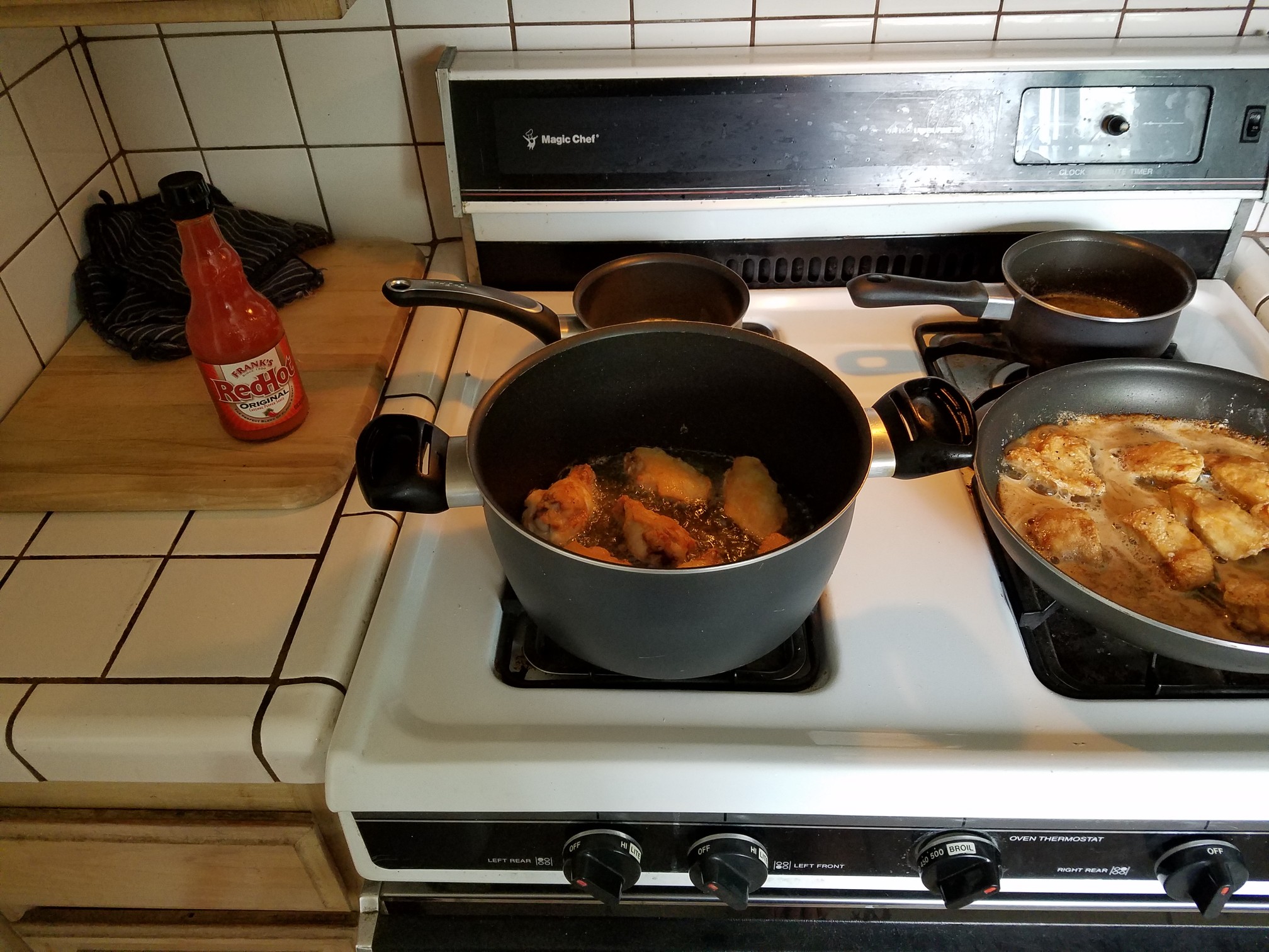 Fuck yes I was! Bone-in wings are on the left, boneless on the right. I wasn’t able to do the “Keep nuggets warm in the 225 degree oven” thing because I was also baking wings but they held up just fine.