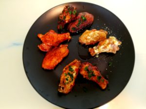 Clockwise from top that’s the traditional Buffalo style, the teriyaki wings, the garlic parmesan wings followed by the spicy Asian wings.