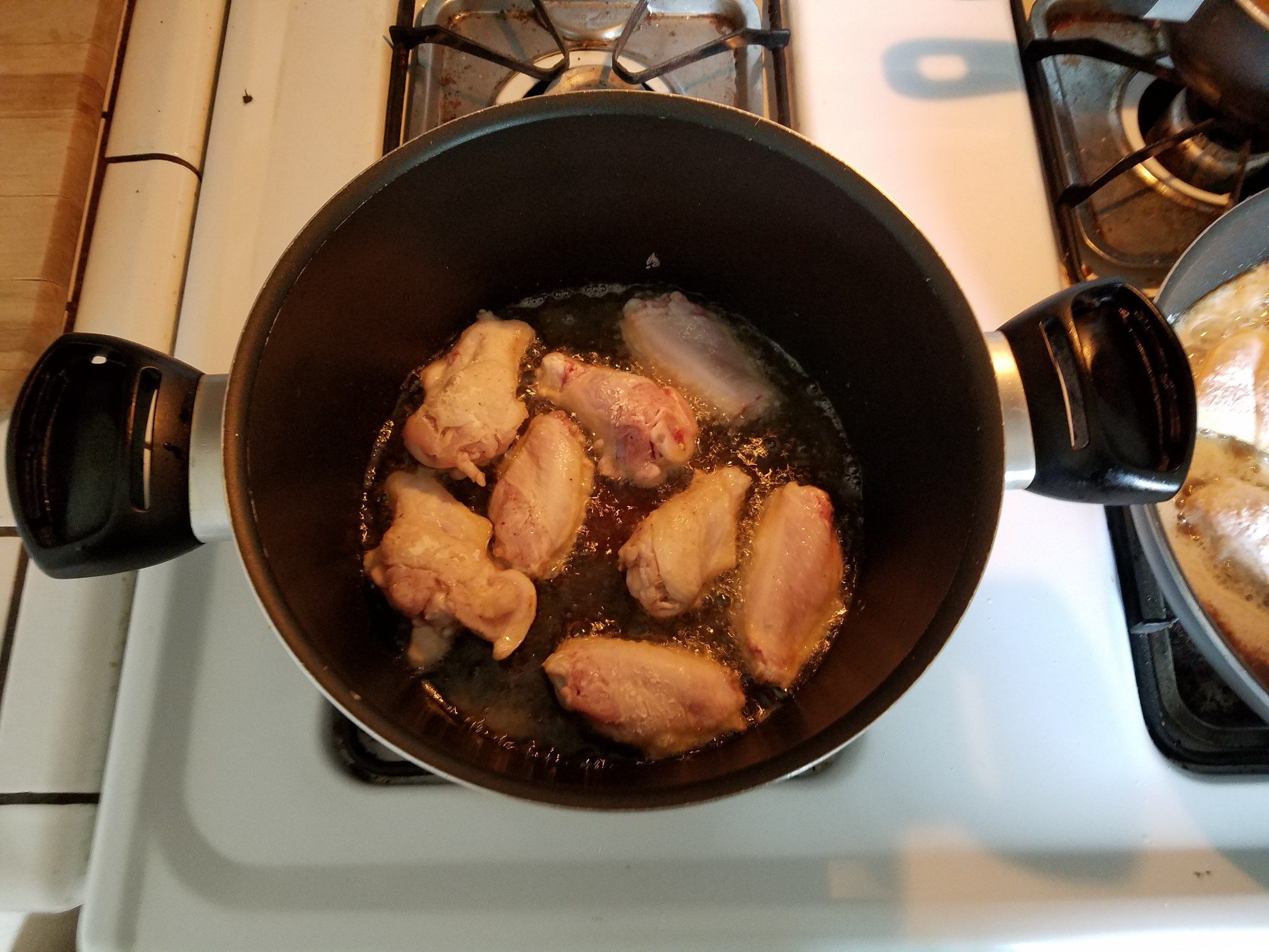 If you’e frying these, get a deep pot or Dutch oven on a medium-high heat and add enough oil to almost but not quite cover the wings.