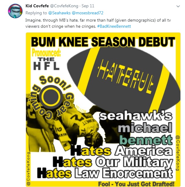 I would show you the Hawks Facebook page, but the 9/11 tribute that leads the page is swallowed up in hatred for Michael Bennett. You will both weep for mankind and pray for meteor.