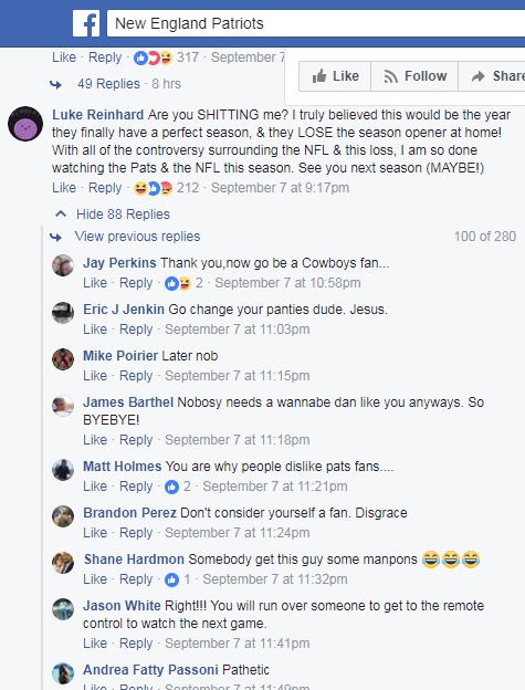 Not to defend Patriots fans, but at least their team has won five Super Bowls in recent history, so they have cause to be a tad testy when someone shows weakness in their support.