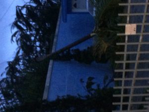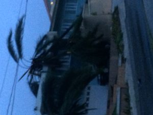 In other well-sourced events, an outdoor drain had to be cleared during the storm every couple of hours. It was being clogged by an immense amount of leaves and several sticks thrust by a torrent of water, and held up by big pieces of debris–tree branches, but mainly by about 8 palm fronds at a time, each anywhere from 5 to 12 feet long. The wind was destroying everything. It was strong enough to knock down any husky lummox venturing outside.