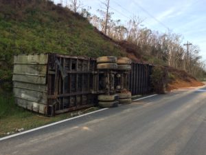 In Aibonito and other towns in the rural center, most roads consist of two lanes, one in each direction. All roads in this area were covered with rocks, mud, whole trees, broken utility poles (wood, metal, and concrete), and pieces of structures (homes, sheds, etc.).