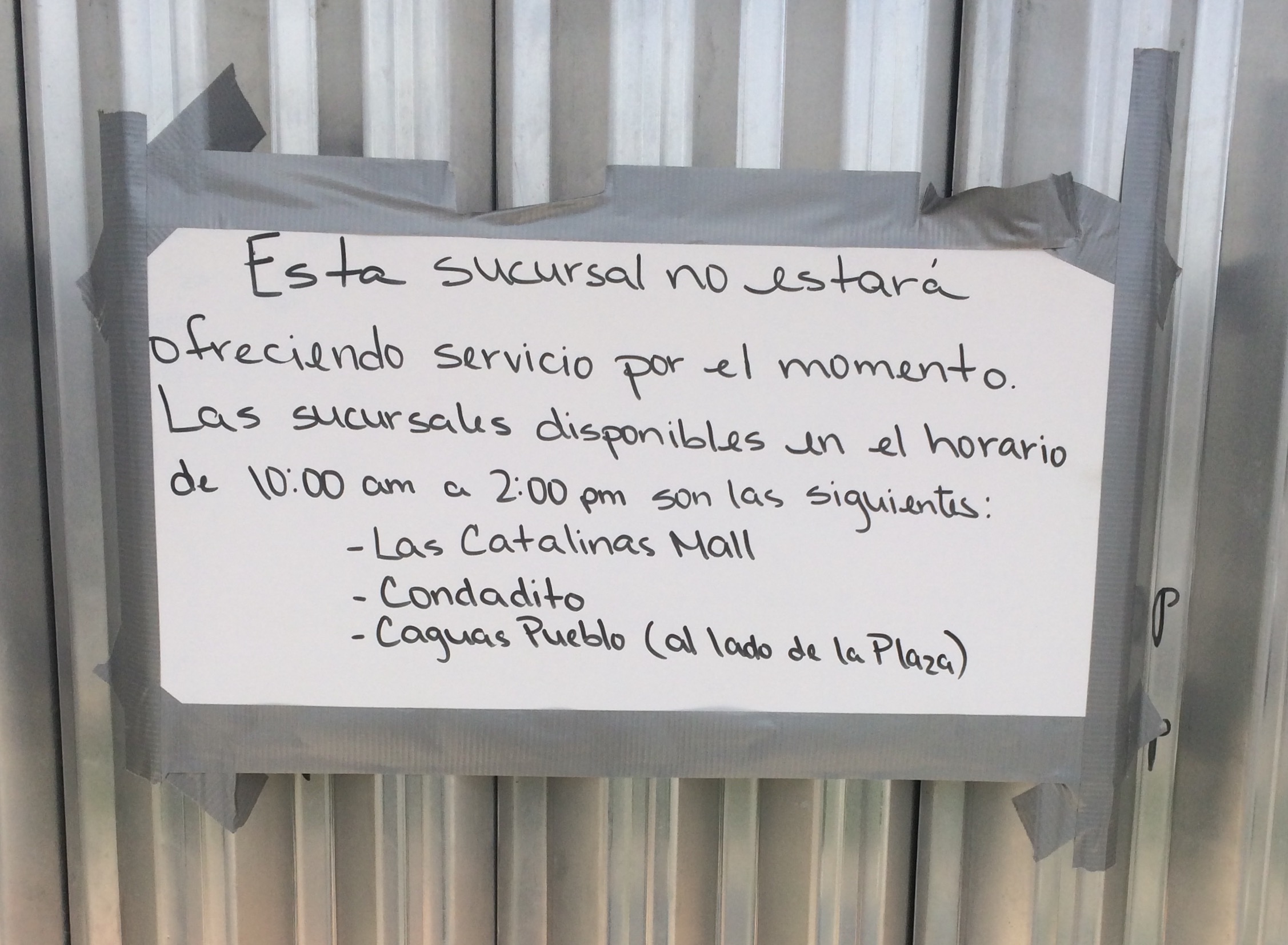 Today is Sept. 28. It’s been nine days. All debris here has been set aside for dumping, or dumped. There’s no electricity. The only information available, about anything, still comes from word of mouth, written notes or placards, and AM radio (at most, two stations out of about 20). The businesses that are open (mostly gas stations, markets, some eateries and bakeries), only take cash. However, the ATMs have been out of money since Sept. 19. This placard was placed on Aibonito’s branch of the main bank in PR:
