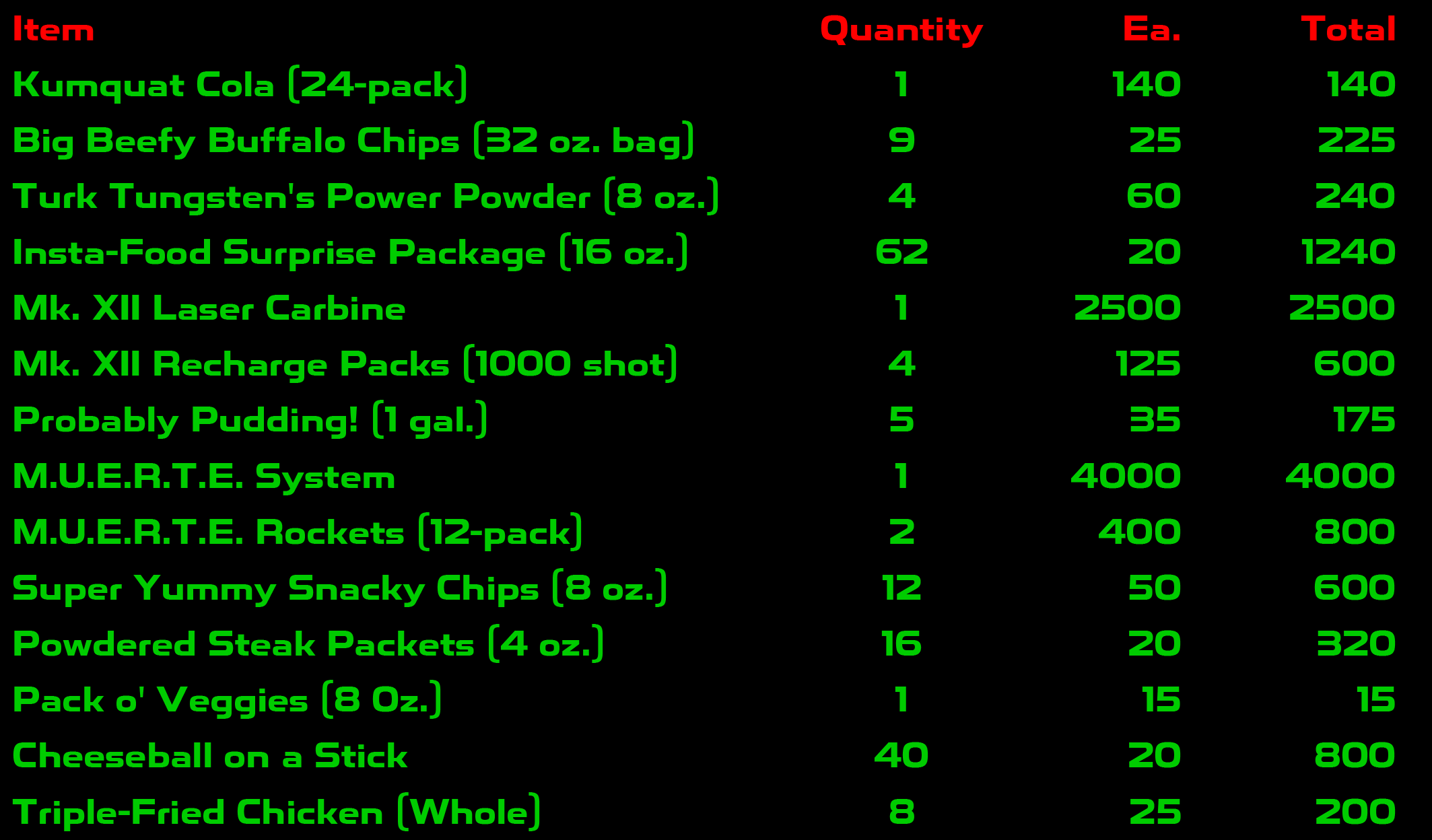 The scene: The Iguana Mart of the Future! While the rest of the DFO has been up to their ears in trouble, Low Commander has been gathering up supplies and is now in a checkout line with a yuuuge cart full of future-stuff. Warblefunk is playing over the sound system. It sounds like a walrus playing a xylophone through a distorted speaker. It’s pretty popular in the future.