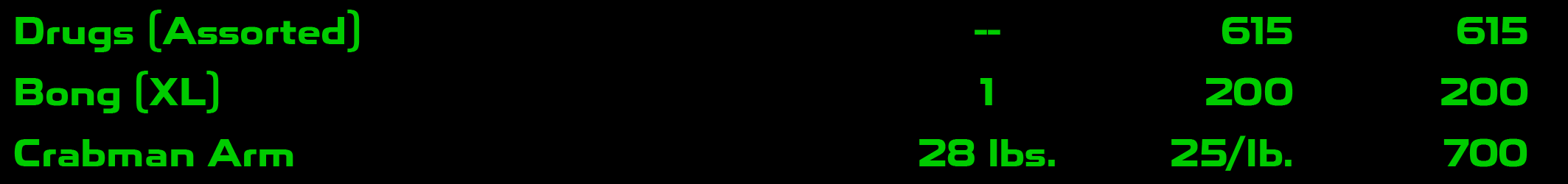 Rikki-Tikki-Deadly and Brocky go running by. Rikki still has the crabman arm and his pockets are overflowing with drugs. Brocky is lugging the oversized bong.