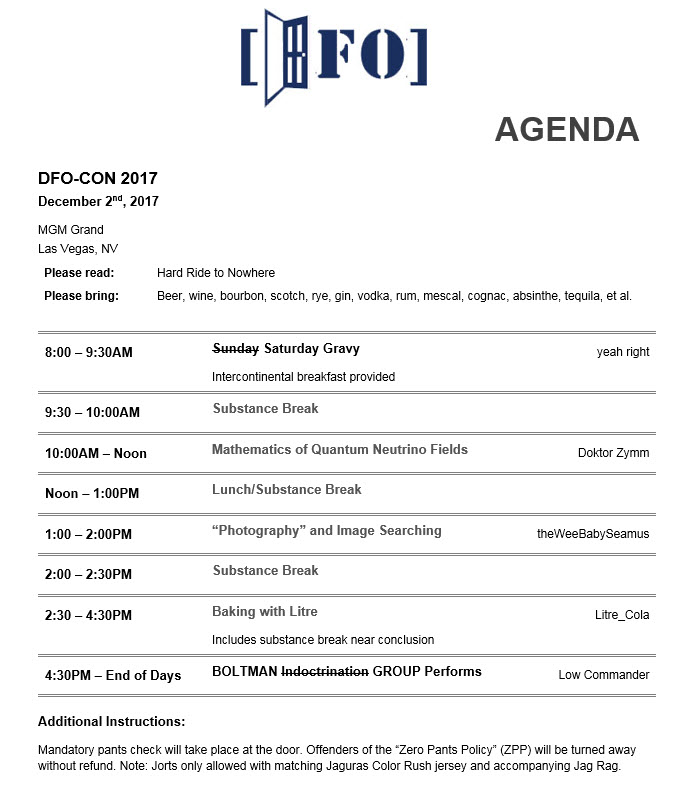 DFO-CON 2017 will take place over the first weekend of December at the MGM Grand in Vegas. Attendees are encouraged to stay at the Grand and arrive/depart as early or late as they’d like, but we’d like to get everyone together on Saturday (12/2) at some point, before sitting down and watching football most of the day on Sunday. I plan to arrive early that morning and leave Monday (12/4) morning. Updates will follow as the date gets closer, but mark you calendars and stay tuned!