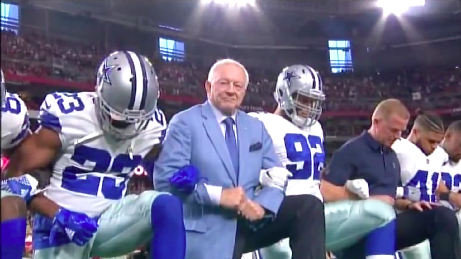 Before we get into the travesty that the Cowboys’ 2017 season is about the become, a few words about Jerry Jones. Unless you were living under a rock the last couple of weeks you know that our grandstanding Vice-President, Mike “I’m Terrified Of Any Woman Not My Mother” Pence, attended a Colts game for what seems to have been the sole purpose of riling up the roughly 30% of America that currently do not pause from digging their fallout shelter to shake their head and mutter “that fucking guy” when referring to his boss. Pence did this by leaving the game after a few players knelt during the national anthem, claiming that he couldn’t be at an event a) where alcohol is served, without his wife, if other women were present, (he actually has said this; fortunately Karen “Mother” Pence was also at the game and able to keep Mike from wandering off the one true path), or b) where people disrespected the flag and military, presumably by peacefully engaging in their right to free speech that the flag represents and that the military fights to protect. Unravel the paradox as you have been taught.