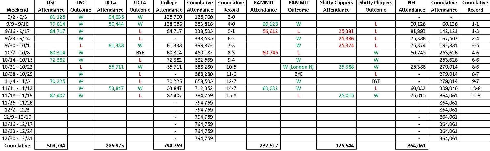 As you can see, USC has already surpassed the half million mark by itself. UCLA is behind in 2nd place while RAMMIT and the Shitty Clippers bring up the rear. One important thing to note is that both USC and UCLA are undefeated at home while the others are 4-5. Let’s take a look at each team one by one: