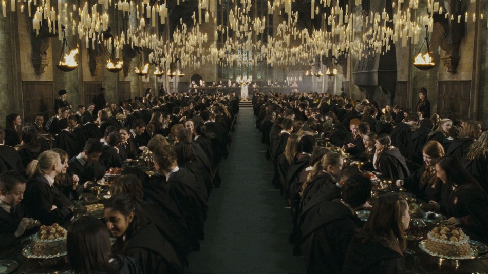 We open on an establishing shot of a gigantic dining hall. Massive oak tables, chandeliers full of candles, and brightly coloured banners abound. The hall is filled with students, most of whom are already sitting and chattering excitedly. The camera tracks upward to an announcer’s booth that overlooks the proceedings.