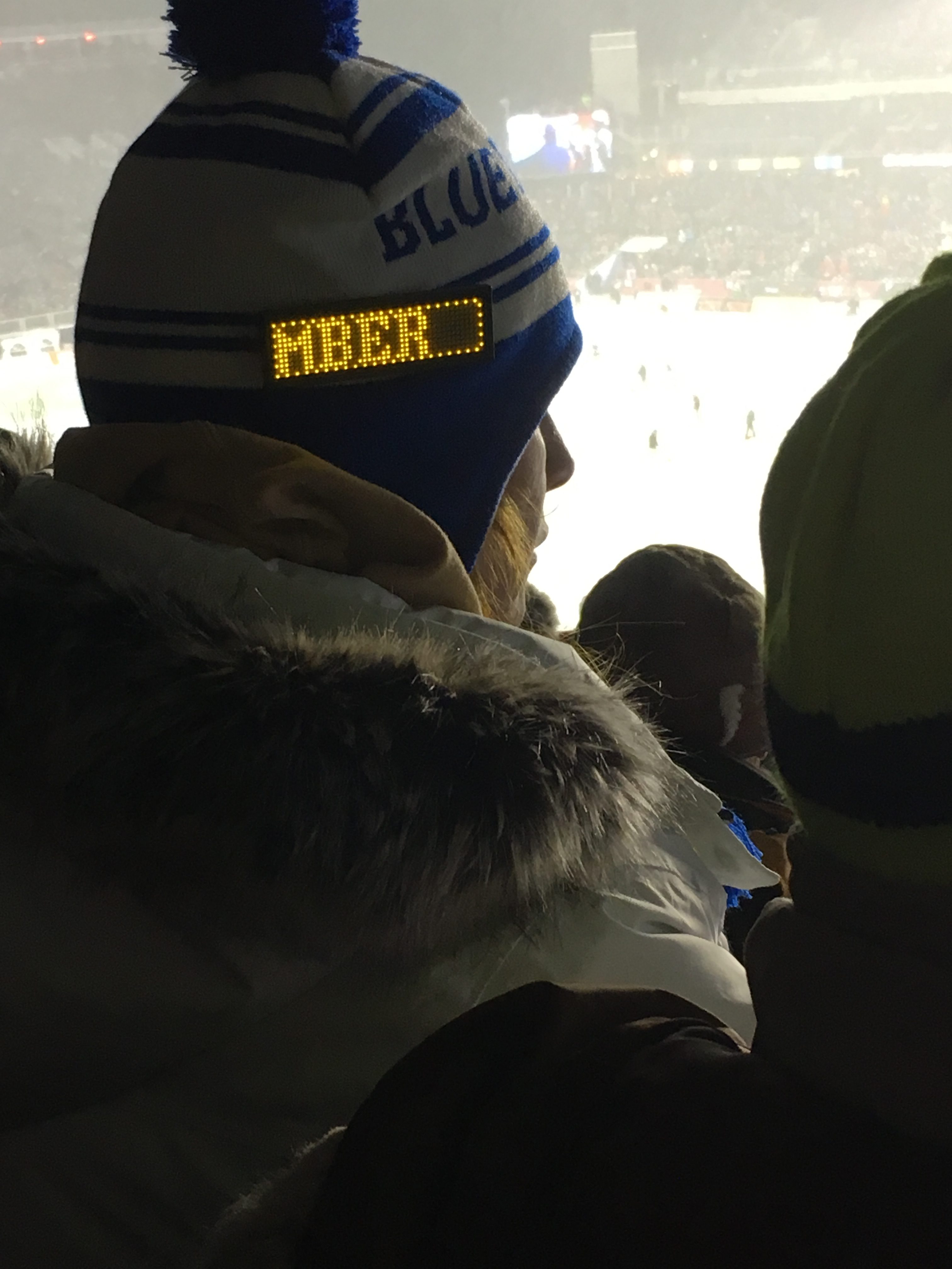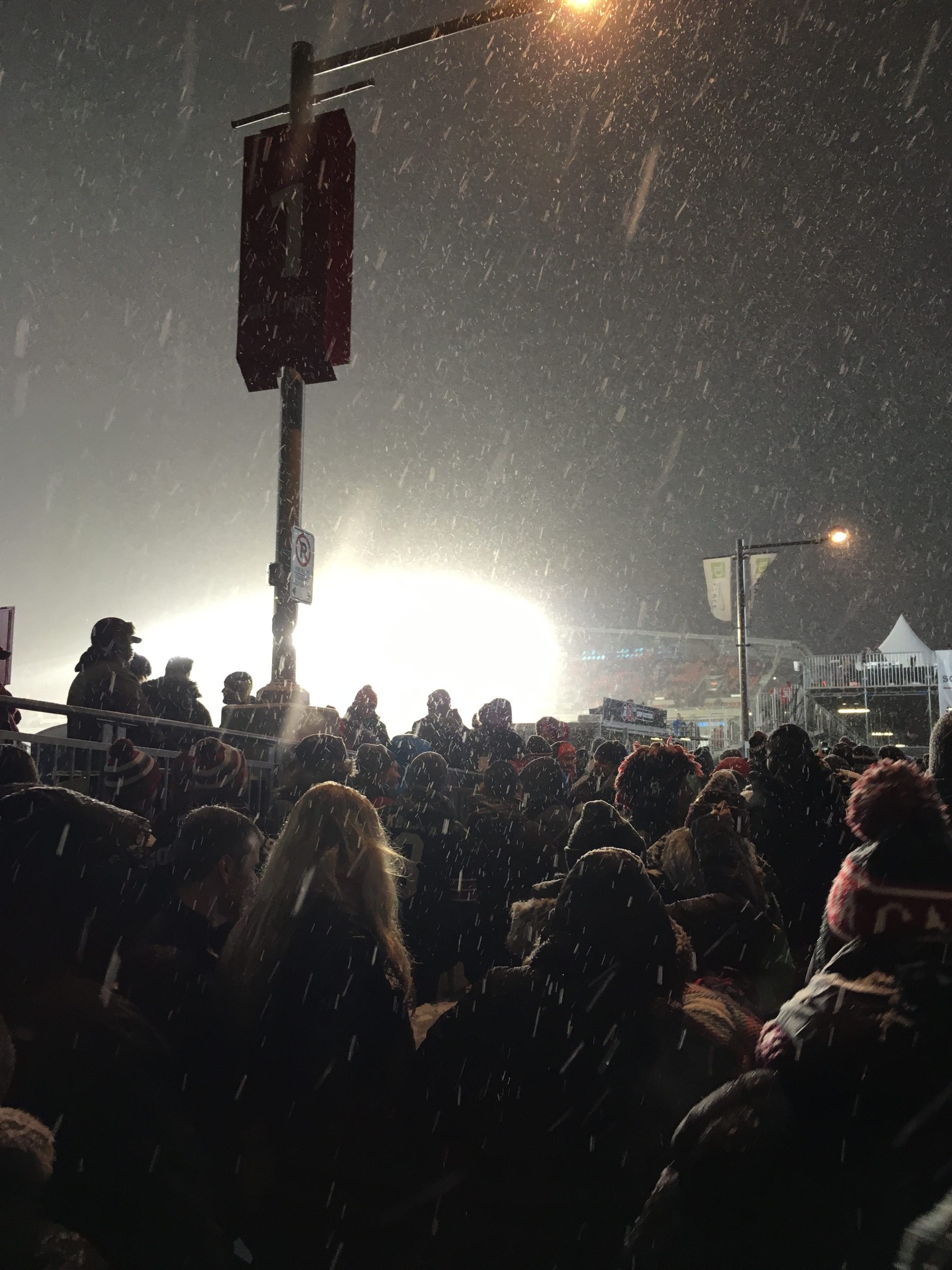 For starters, I need to give a rundown of the clothing I was wearing to this game. It’s essential, in fact, because it’ll help you contextualize the weather. This game was played in the snow, with the temperature hovering around -2 degrees Celsius (about 28 degrees Fahrenheit), though in our section on the North Side, wind wasn’t much of a factor which was nice. Here’s a quick rundown of everything I had to put on to stay warm over the four hour period I was in the stands: