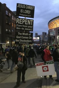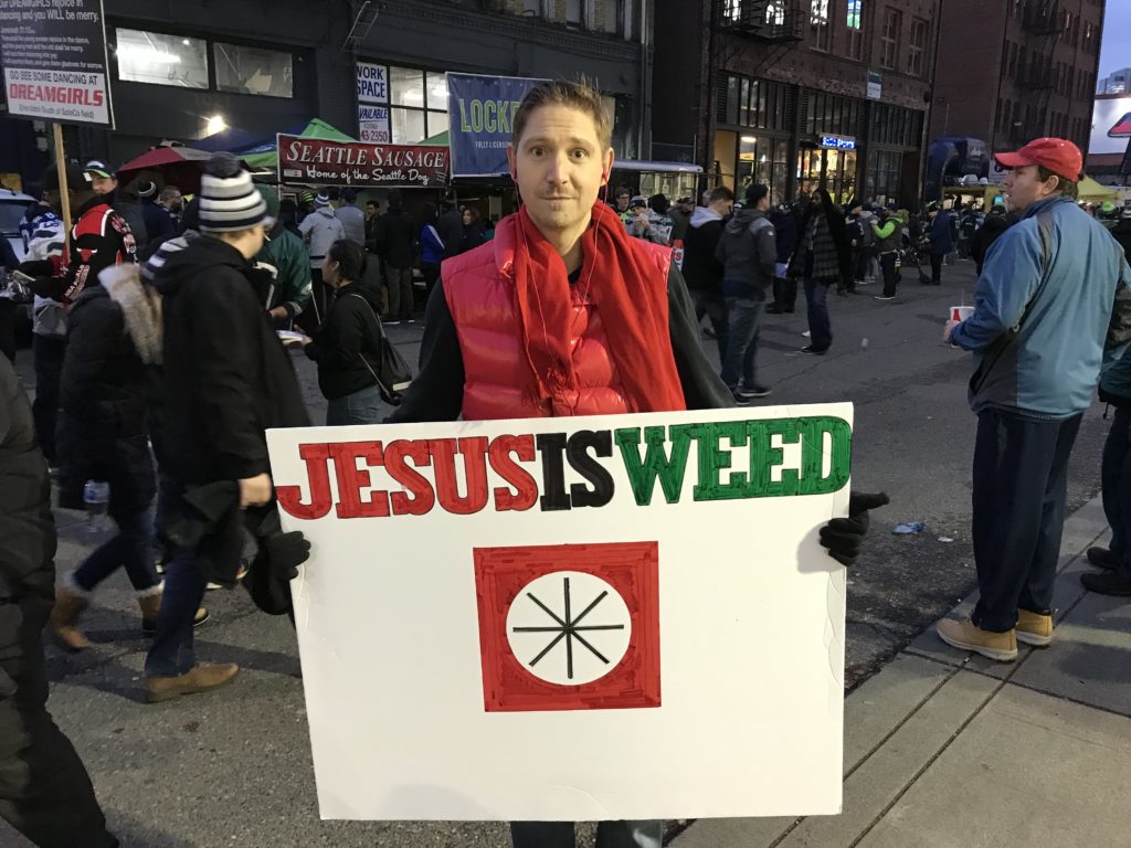 There was a larger-than-normal collection of the Jesus freaks out last night at the Seahawks game. It seemed a little odd – usually, I see them before the afternoon kickoff, because we heathens have spent the morning in Bacchus’ palace rather than the Lord’s temple. Methinks they were out due to the national broadcast & hopes they could get into a crowd-shot before the game.