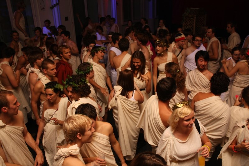 He steps around a group of students who are watching someone do a keg stand.