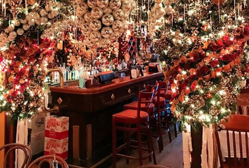 A single patron enters the bar, immediately swiveling his head in all directions to ascertain the conditions of his surroundings, the young man immediately notices two things. First, the bar is decked out in festive — though slightly different than his own tastes — holiday decor. Second, there are only a few patrons enjoying drinks but none of them seem to notice him. He exhales a sigh of relief and approaches the bar.