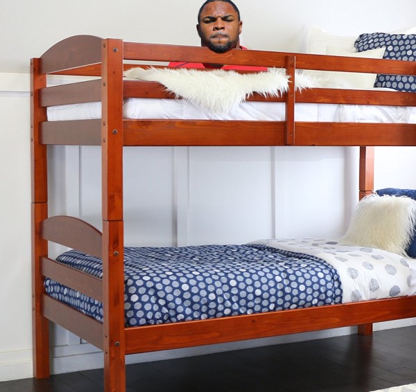 CAM offers his shoulders for DOUG to climb onto. The two of them teeter around the room until CAM finally dumps DOUG onto the lower bunkbed, which is empty.