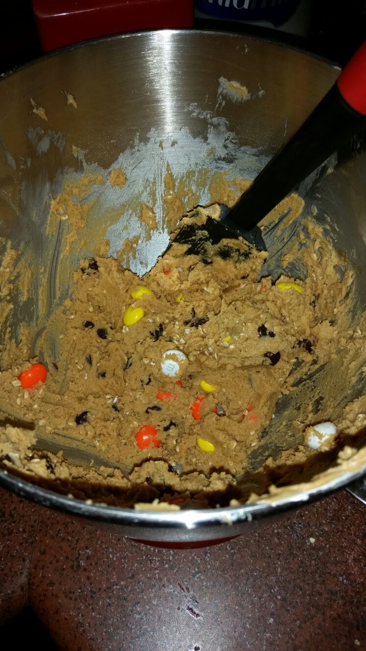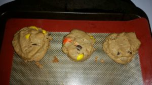 This cookie has peanut butter, chocolate chips, peanut butter, oats (healthy!), and the candycorn m&m’s. I did wonder how the white chocolate taste would mix with the peanut butter but we will see.