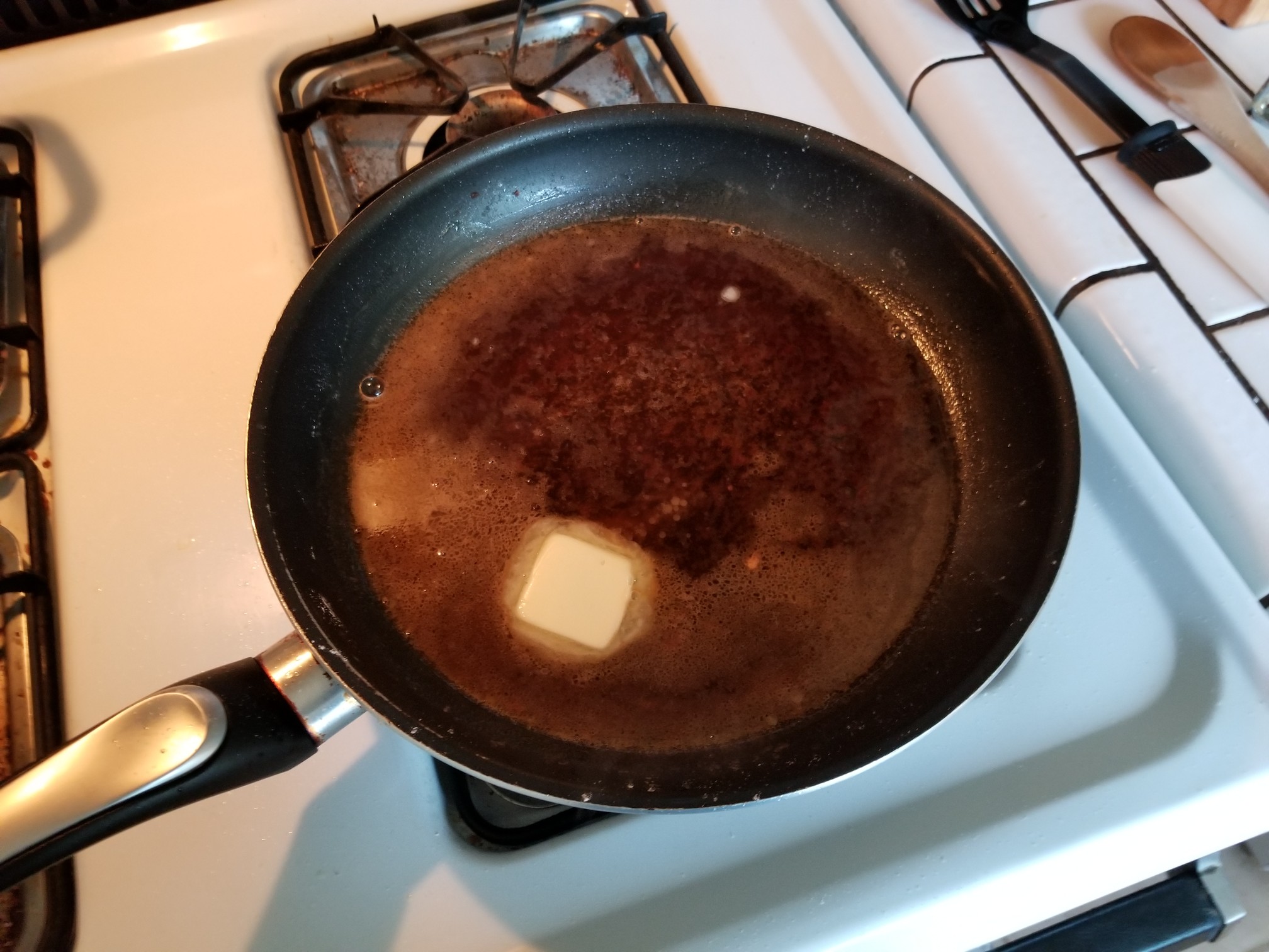 Remove the pan from the heat and stir in the Marsala. Give a few stirs to scrape up the browned bits from the meat. Return the pan to the heat. Next add in the butter one tablespoon at a time.