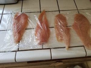 Place the chicken between two sheets of plastic wrap and get ready to pound your chicken.