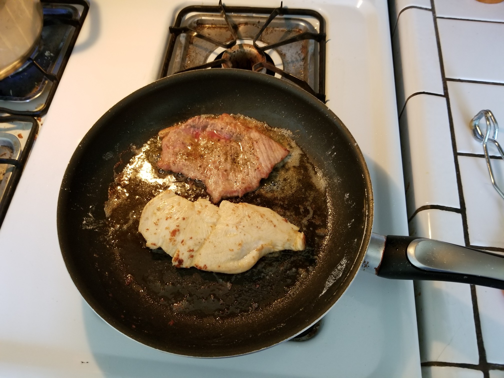 I made 3 cutlets of veal and 4 of the chicken. Here’s the 2nd shot of the pan where the two types of protein are side by side and coexisting wonderfully!