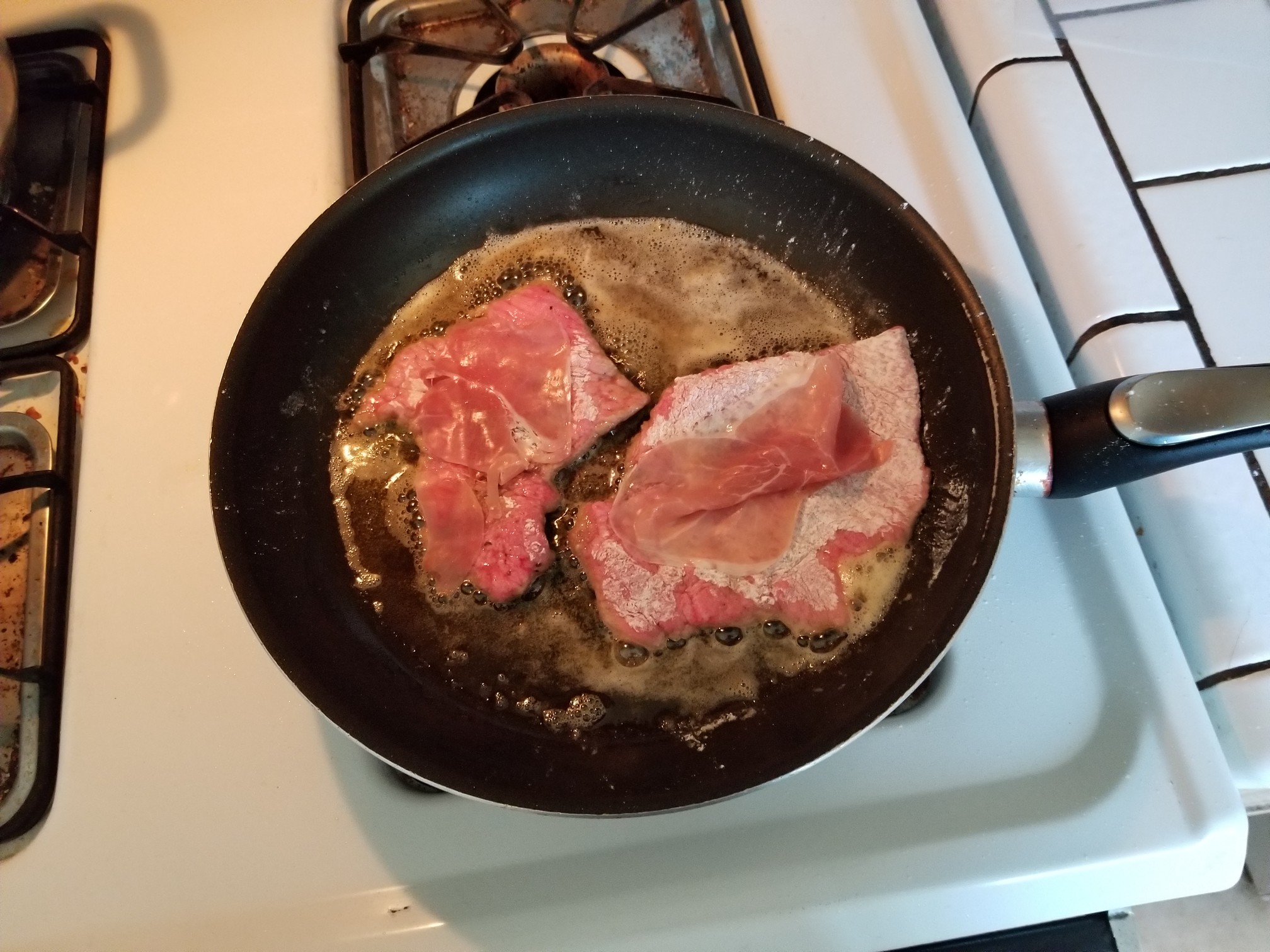 The veal will cook for 3 minutes per side. Start with the proscuitto covered side first.