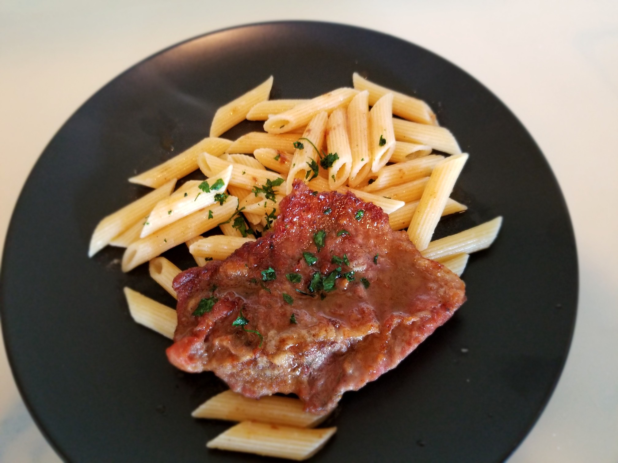 Finally, cook some pasta. I had some penne on hand and after cooking to al dente I tossed it lightly in a butter and sage sauce. Plate the pasta, if you wanted to add a couple of grates of real parmigiano reggiano or pecorino Romano (this is a Roman dish remember) this would be the time to do so. Place one of those lovely cooked cutlets on top of the pasta, then get a spoon of the pan sauce and drizzle over. This is a sauce dammit not a gravy so don’t drown the meat in it. Please note I didn’t use any fontina cheese on the veal. I wanted it in it’s classic form
