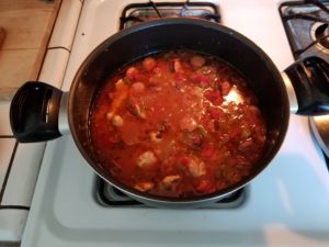 When the trinity has cooked down for the allotted time get the rest of the ingredients in the pool. Back goes the chicken, then toss in the sliced sausage, the garlic, the extra thyme, cayenne, the hot sauce, the Worchestershire, bay leaves, the chicken stock and both cans of tomatoes.