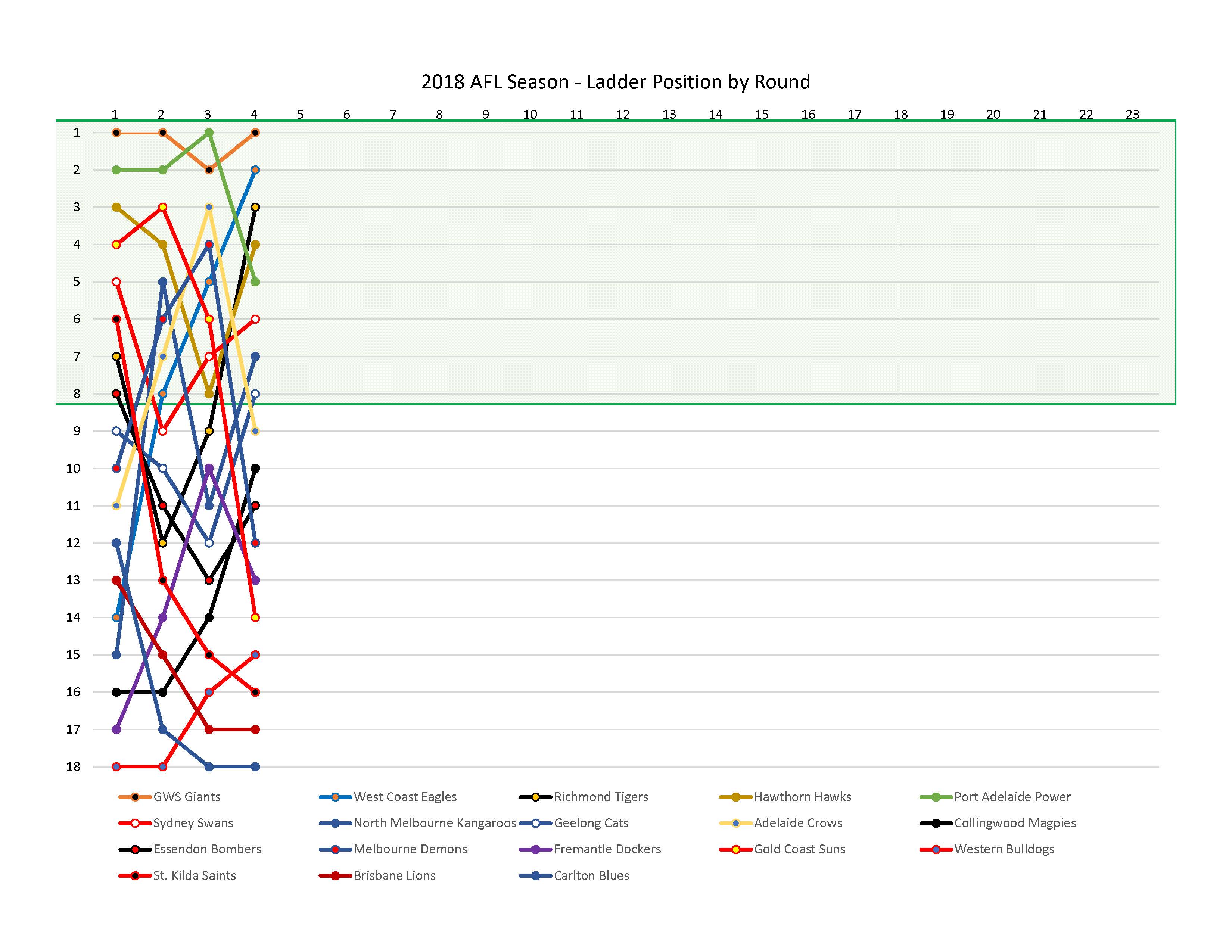 We still have a TON of movement in the middle with only GWS consistently on top and the bottom four (I’m thinking five) more clearly defined. It’s going to be one heck of a ride this season!