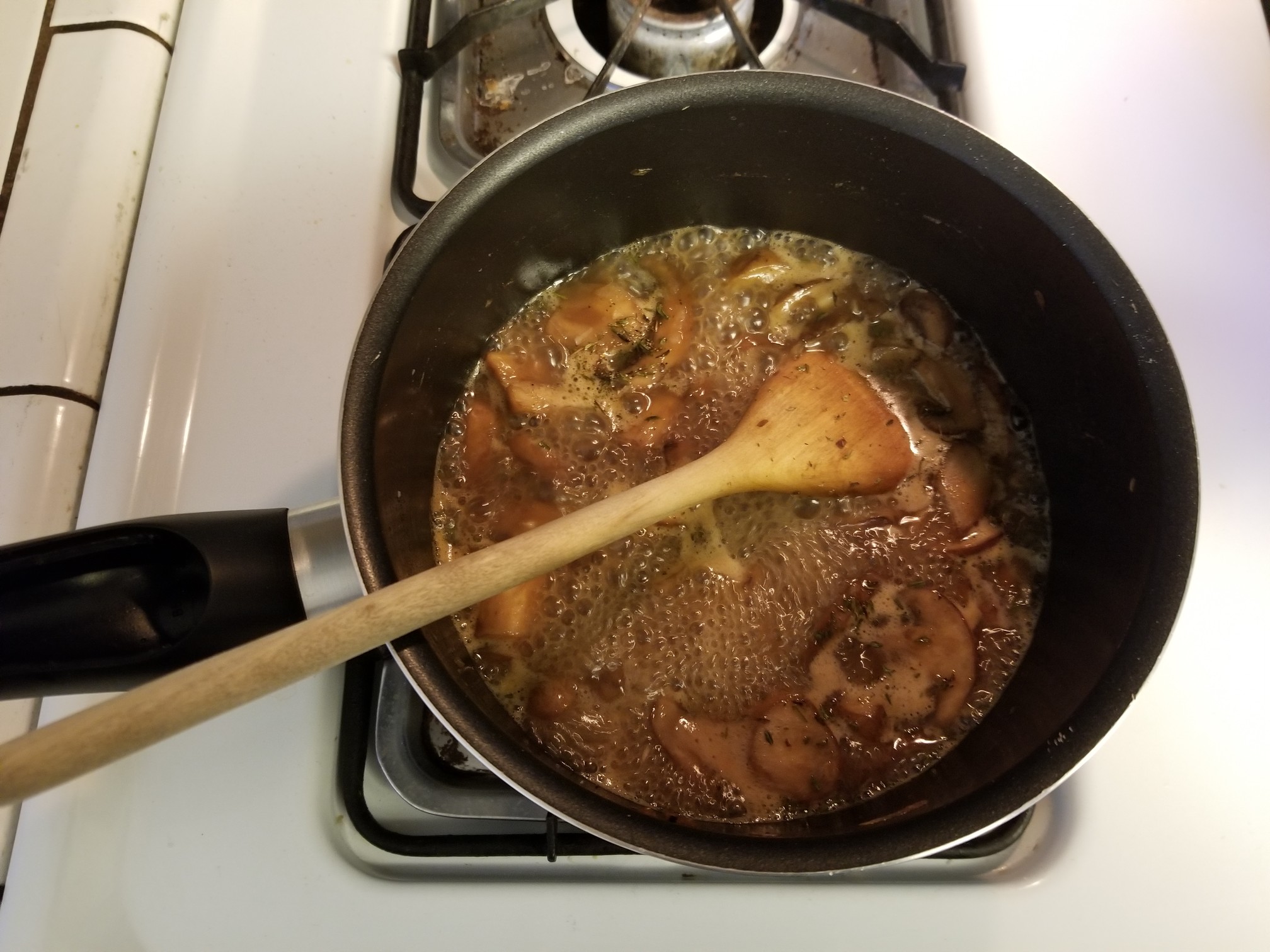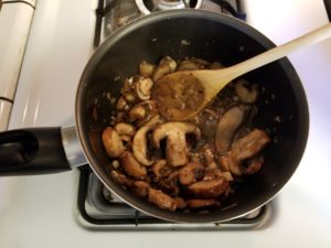 Get out a medium sauce pan. Scrape the browned bits from the pan that you seared the tenderloin in and get it in the pan. Melt the 2 tablespoons of butter and then add in the mushrooms and shallot.