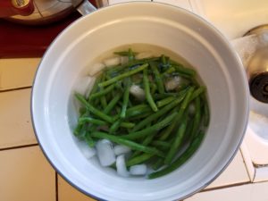 Place a pot of water on the stove and bring to a boil. Cook the beans in the boiling water for 3-4 minutes. Remove the beans and put them immediately in an ice bath to shock them and stop the cooking process.
