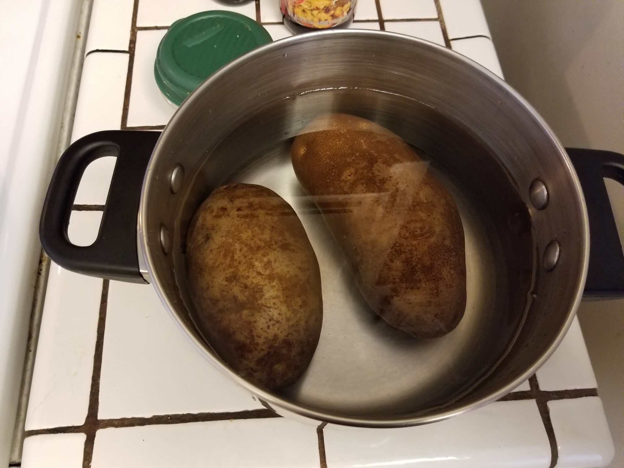 Clean and rinse the potatoes and put them in a pot of water with enough water to cover by about an inch. Bring to a boil and cook whole for 45 minutes. Let the potatoes cool and the skins will peel right off.