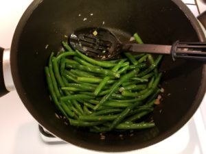 When the oil is hot, add in the shallots and the green beans and saute for 3-4 minutes until the beans start to get crisp and are just starting to brown. Next add in the garlic and ginger.