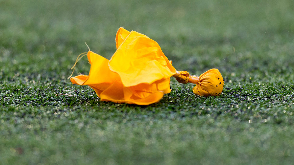 A series of whistles sound as a flag is thrown towards the Dolphins sideline.