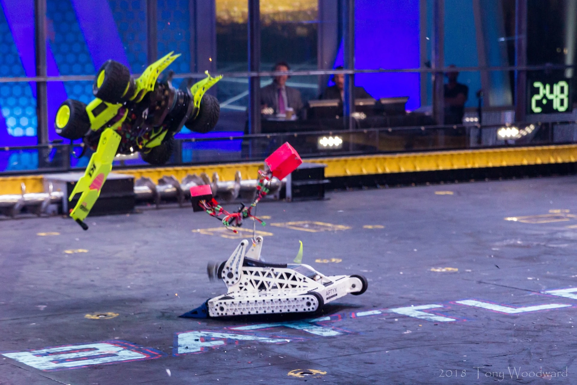 HyperShock’s Achilles heel, however, has been reliability issues. So when one member of the team asks if anyone saw those sparks as they’re driving the robot around in the pre-fight test, it’s half “Fuck it, YOLO” and half “Oh son of a bitch, here we go again.” Apparently the robot moving was building a static charge inside it leading to radio interference. HyperShock was a Van der Graaf generator, which is cool and all, but it’s less than ideal to bring a Van der Graaf generator to a robot fight. Which Bite Force took advantage of, managing to win a weapon-to-weapon exchange, damaging HyperShock’s weapon and/or one of the self-righting arms a bit in the process and flipping it over. Then coming in for the kill was pretty cool. The slow-mo (no idea if it exists on the Interwebs yet, probably?) showed it was a three-hit combo that hit wheel, weapon, and top cover of HyperShock. And they were silly and used rubber mounts for the first fight. So the top came off and the battery encasements flew out. Also Bite Force ate some of their wiring. As seen here. Which is captioned on HyperShock’s Facebook page: “As far as we can tell, someone eating out your electronic entrails does not count as entanglement.” This is true. So unfortunately it’ll have to be Take 2 with Troncycle mode, as Bite Force wins by KO in like 36 seconds, becoming the first bot of the year to go 2-0.