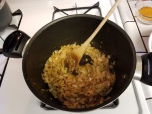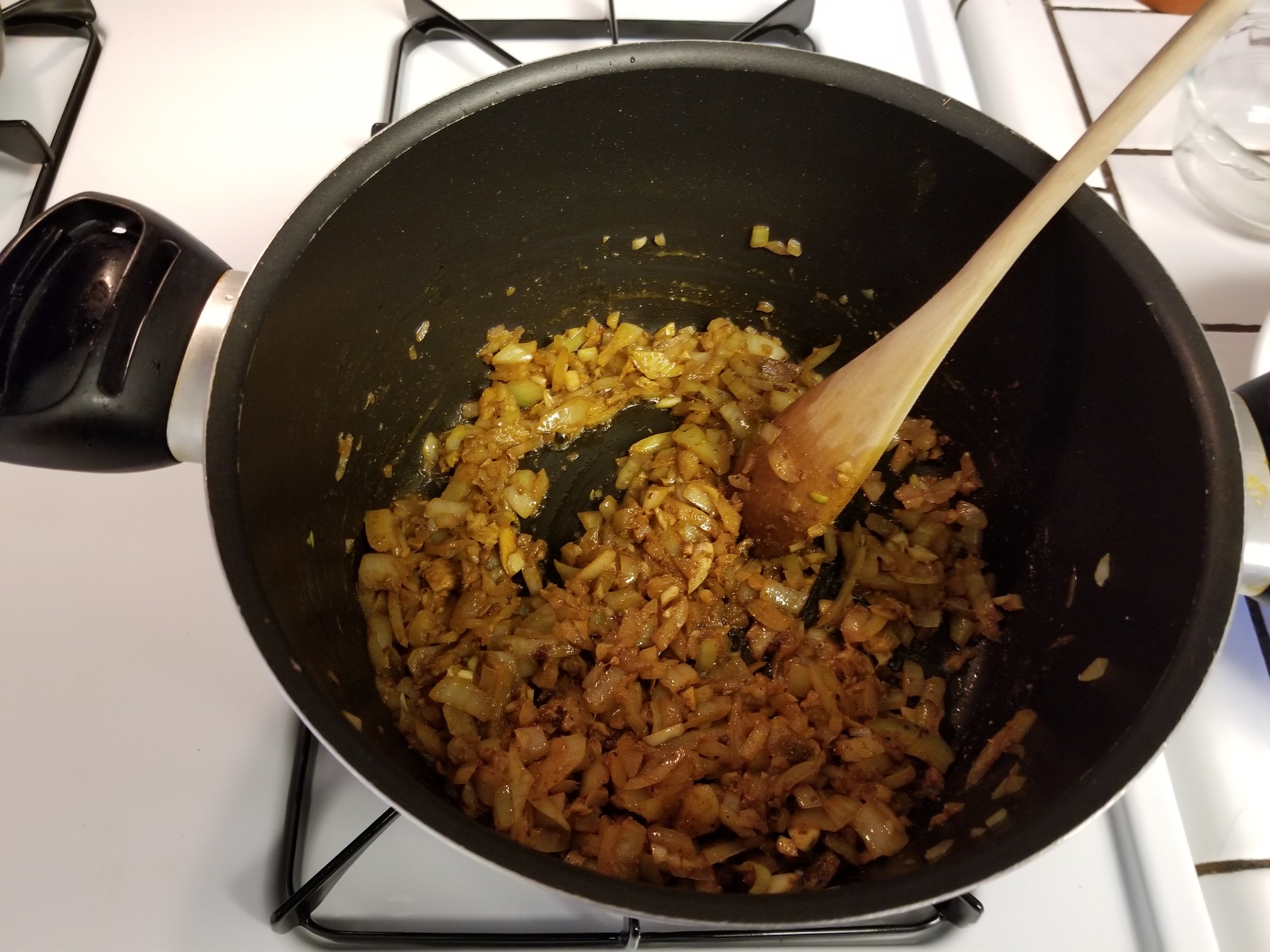 Cook the onion until translucent, maybe 5-7 minutes. Be sure to use a wooden spoon to scrape up the ginger and garlic bits from the marinade. Next add in the minced ginger, garlic and spices. Give a quick stir and cook just until fragrant, maybe 30 seconds or so.