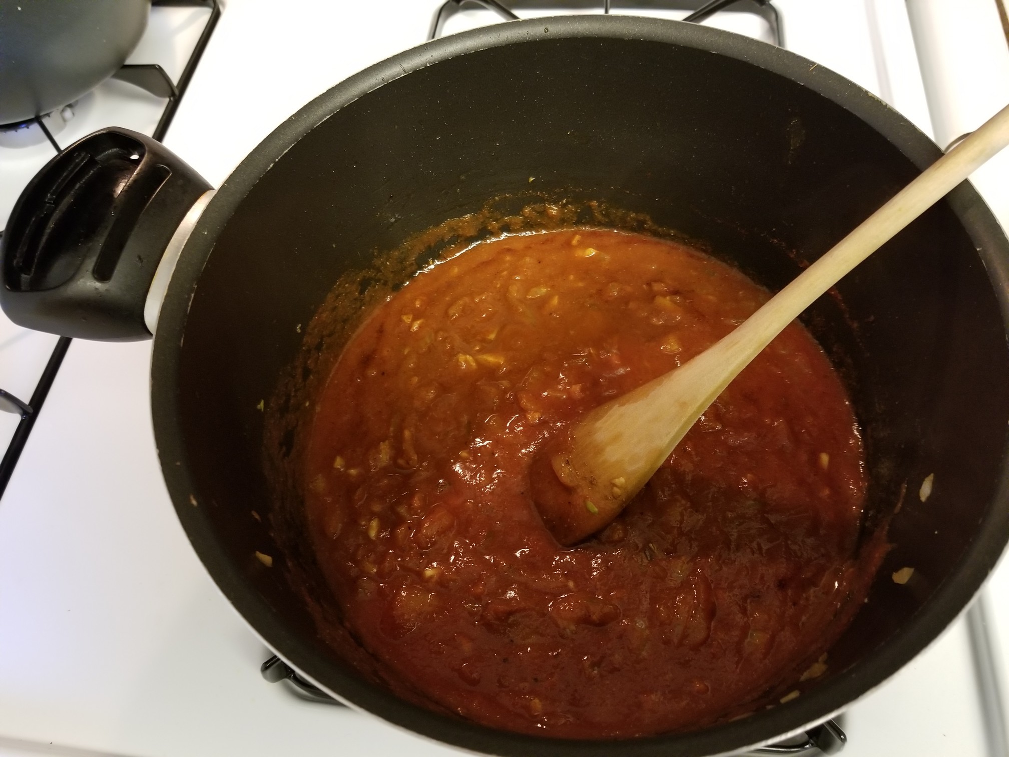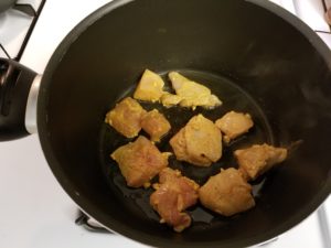 Using a non-stick skillet or Dutch oven – tomato sauce, right? – place over a medium high heat. Add in the cooking oil and let’s brown that chicken, coated in marinade and all.