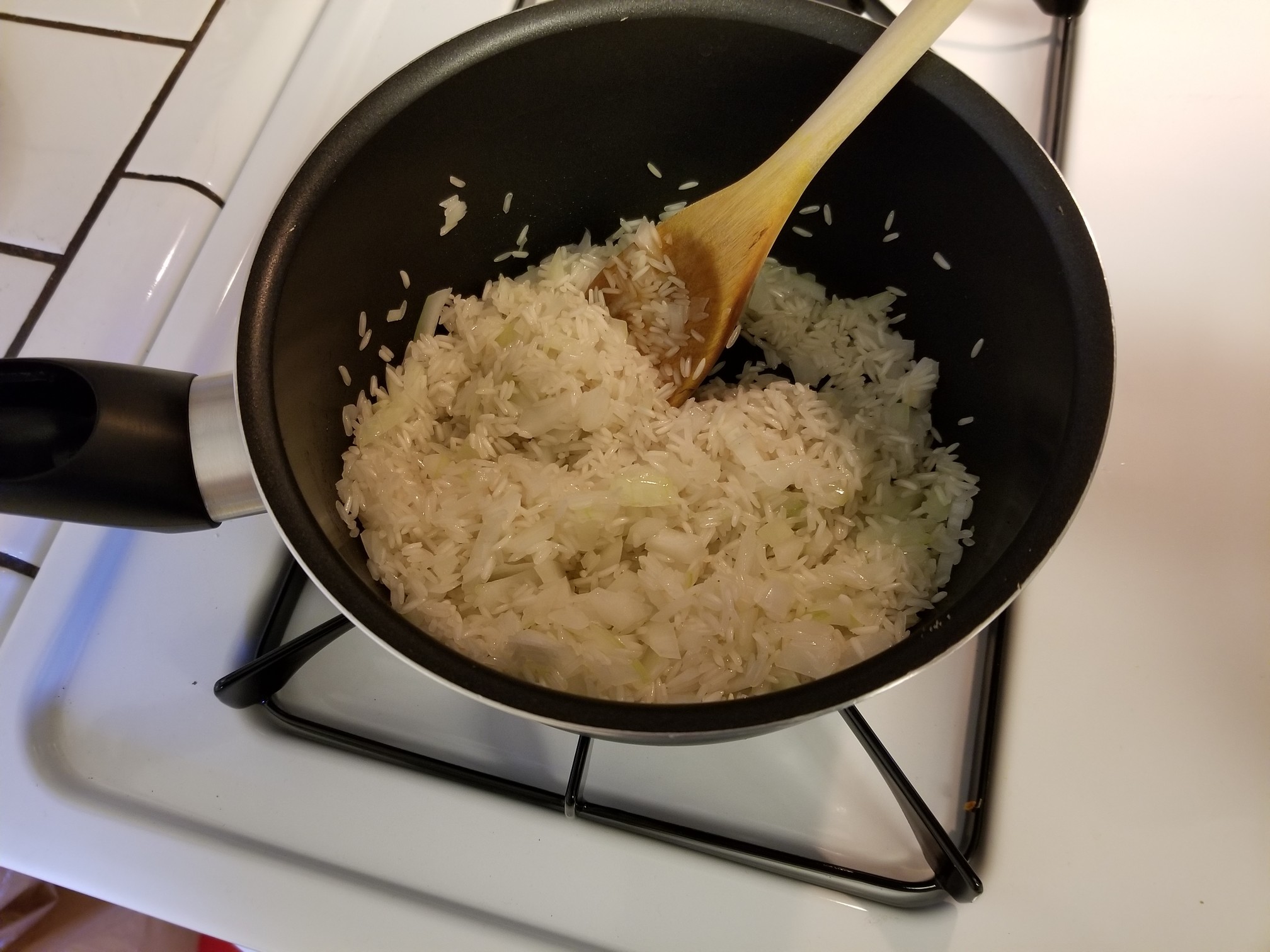Get out a sauce pan and place over medium heat. Add in the butter until it melts. Next add in the rice and the onion and saute until the rice gets toasty and the onion cooks through. 5-7 minutes or so.