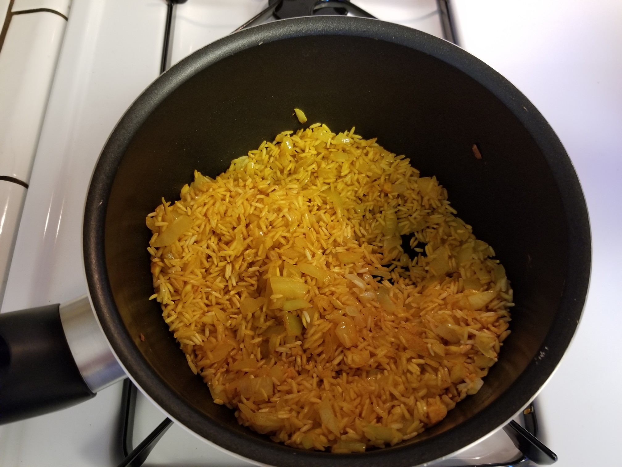Toss in that turmeric and garlic and stir until fragrant and the rice has turned a lovely golden color.