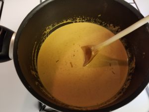 When the sauce has thickened a little and turned a nice shade of red we will add in the heavy cream and the brown sugar.